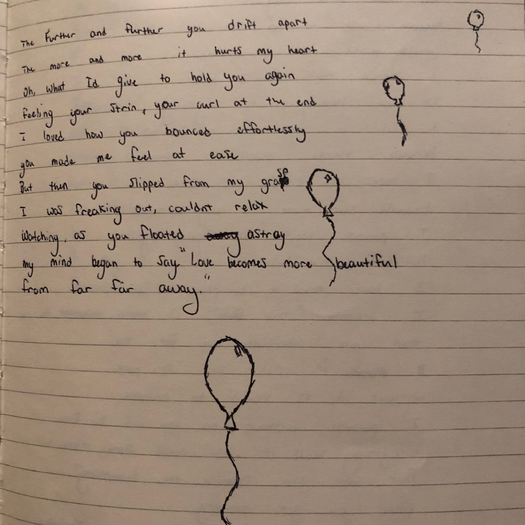 The further and further you drift apart the more and more it hurts my heart. Oh, what i would give to hold you again feeling your string, and the curl at the end. I loved how you bounced so effortlessly you made me feel at ease. But then you slipped from my grasp I was freaking out, could'nt relax. Watching was you floated astray, my mind began to say, "love becomes more beautiful from far far away".