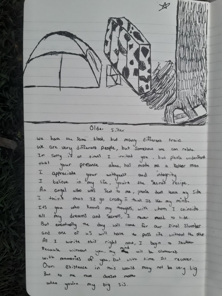 We have the same blood, but many different traits. We are very different people, but still we relate. Im sorry if at times I irritated you, but please understand that your presence alone has made me a better man. I appreciate your wittiness and integrity I believe in my life, you're the secret recipe. An angel who was sent to me, please don't leave my side I think I'd go crazy, I think I'd lose my mind. Its you who knows my thoughts, with whom i coincide all my dreams and secrets, I never have to hide. But eventually the day will come for our final slumber and one of us will have to pass life without the other. As I write this I begin to shudder because without you, my mind will be cluttered with memories of you, but with time I'll recover. Our existence in this world may not be very big. But to me that doesn't matter when you're my big sis.